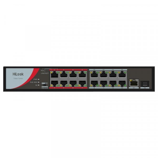 • Unmanaged switch with 16 x 100 Mbps PoE ports, 1 x 1000 Mbps RJ45 port, and 1 x 1000 Mbps SFP port